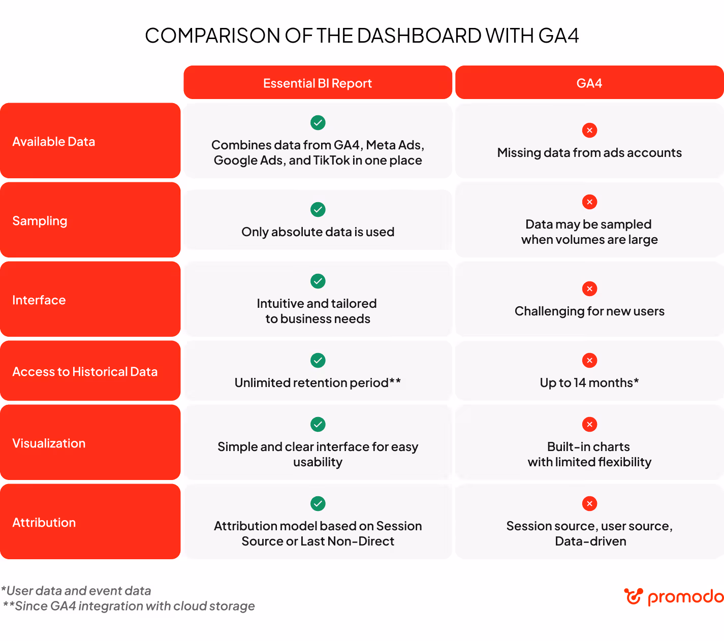 Besides this, Google Analytics 4 does not pull data from Google Ads, Meta Ads, and TikTok Ads accounts, making it impossible to assess the full effectiveness of channels and campaigns in a single report.