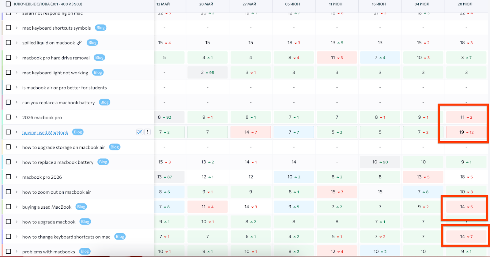 In the table, we pay attention to columns with negative traffic dynamics. We are interested in pages with the highest percentage of traffic decline. At the same time, it is worth checking whether there have been any significant changes in the content, structure, or external factors on these pages. Perhaps the article was recently updated but has not yet begun to rank.