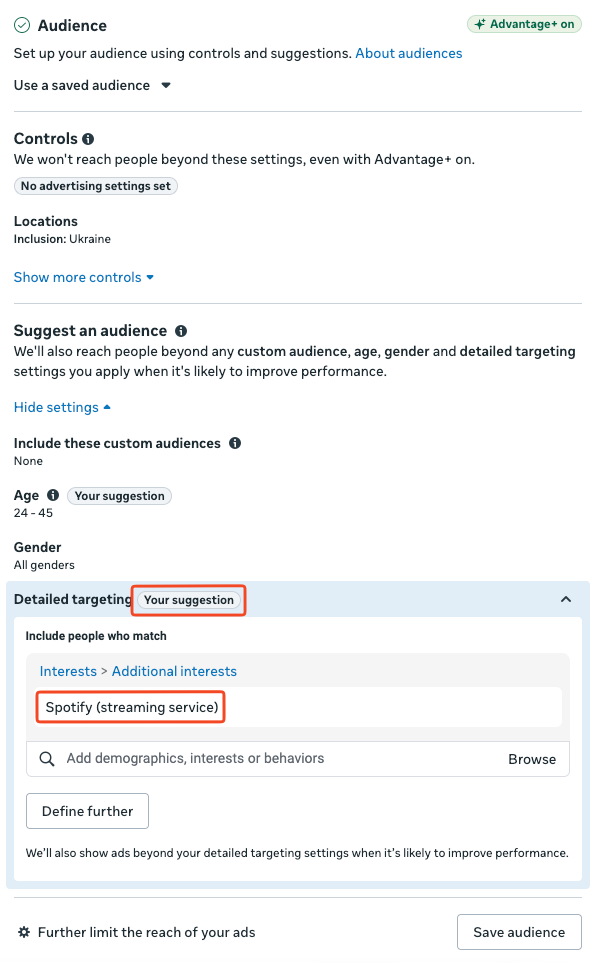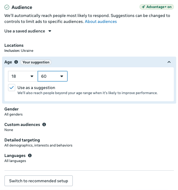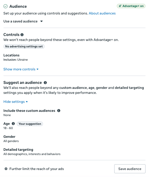 Manual settings haven’t disappeared, but without additional constraints, they now act more like signals to the algorithm. For example, age and gender limits can still be set as hard targeting rules. Interest targeting, however, works as a recommendation. This way, you tell Meta which audience you believe is more important to your business. The only setting that hasn’t changed is location targeting: geography is a strict rule.