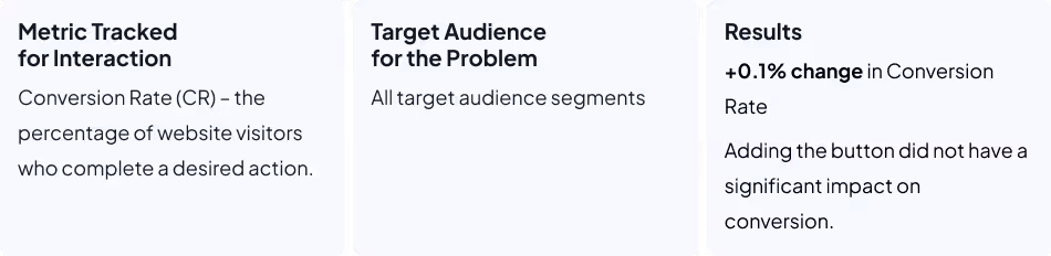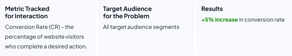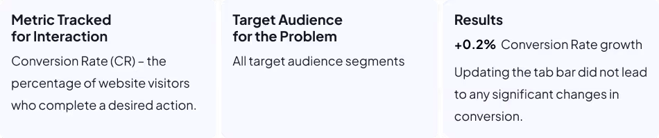 Based on our research, we formulated over 40 product hypotheses aimed at improving overall conversion rates. All ideas were prioritized using the RICE methodology, and the most valuable hypotheses were tested through A/B experiments to accurately measure their impact.