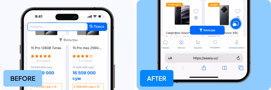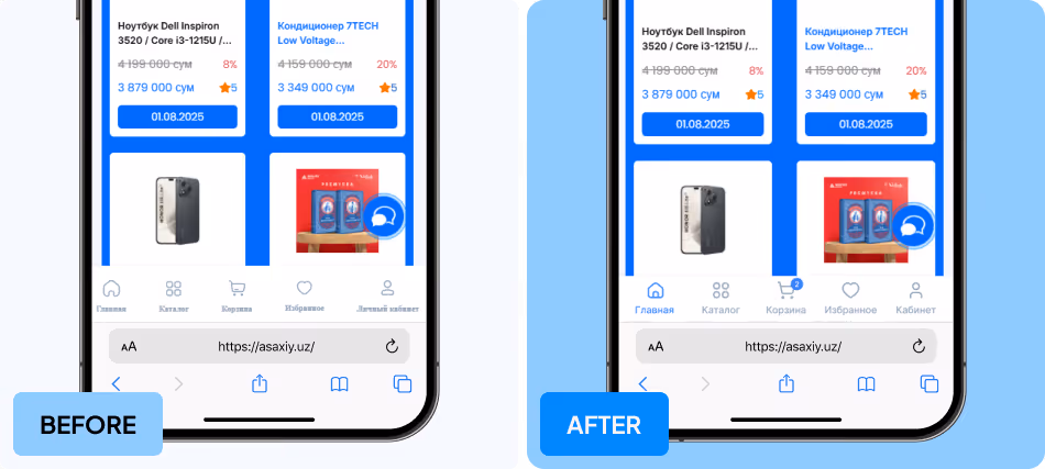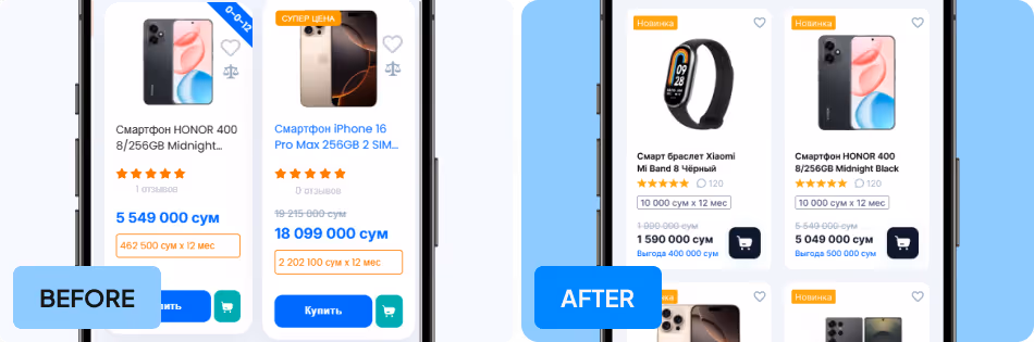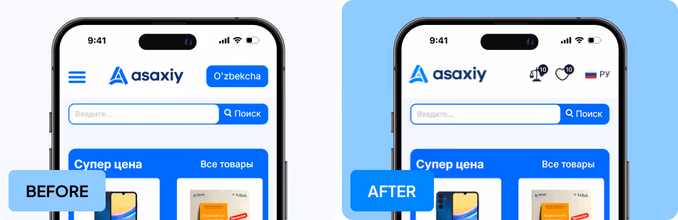 Beyond analyzing direct competitors, we expanded our research to understand two levels of context: globally recognized eCommerce standards and unique solutions specific to the electronics niche. This approach allowed us to combine universal usability principles with the emotional needs of Asaxiy’s customers.