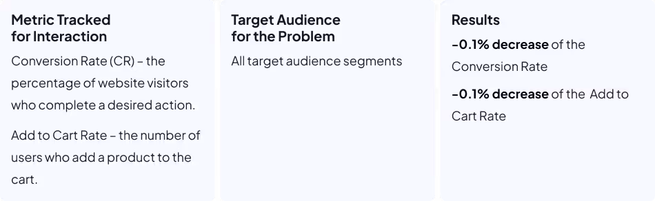 Analysis of the key conversion stage—moving from the product page to the cart—revealed substantial potential customer losses. The Add to Cart Rate was just 4.5%, nearly half the industry average of 8–10%. Such low conversion at this stage suggested issues with product trust or unclear purchase conditions, such as insufficient information about shipping and returns.