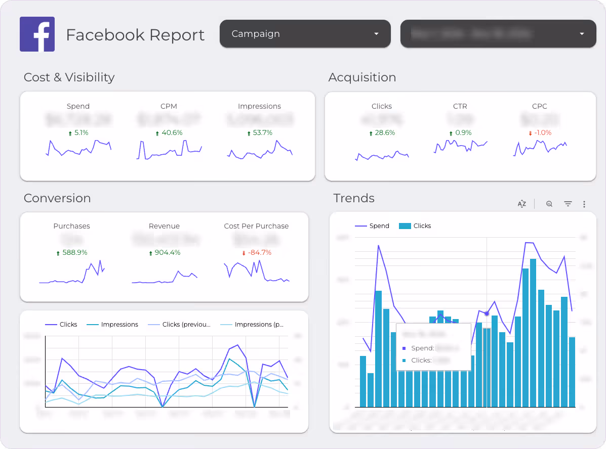 By integrating data from Meta Ads (Facebook and Instagram), the report allows you to analyze costs, CPM, CPC, and assess how campaigns impact conversions and revenue.