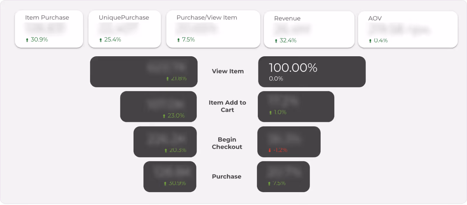 The report displays the percentage of users progressing through each stage of the funnel — from product view to add-to-cart, checkout initiation, and purchase. This enables you to quickly detect bottlenecks in the sales process.