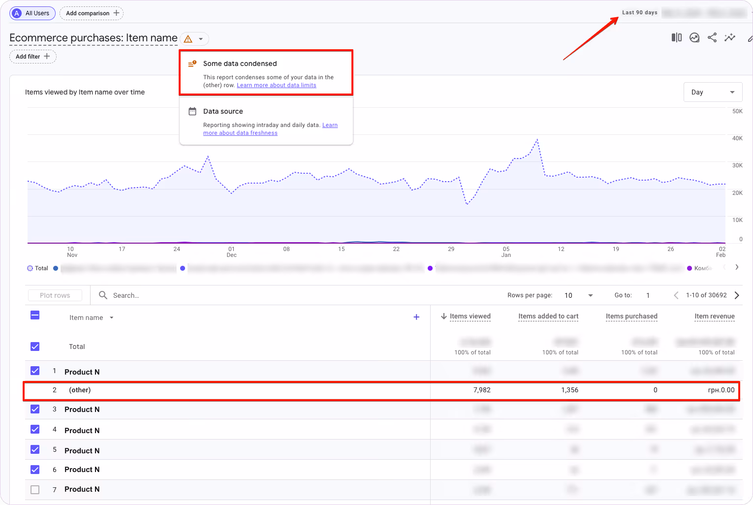 When viewing the product performance report in Google Analytics 4, selecting a 3-month period often leads to some products being aggregated into the “Other” category due to cardinality.