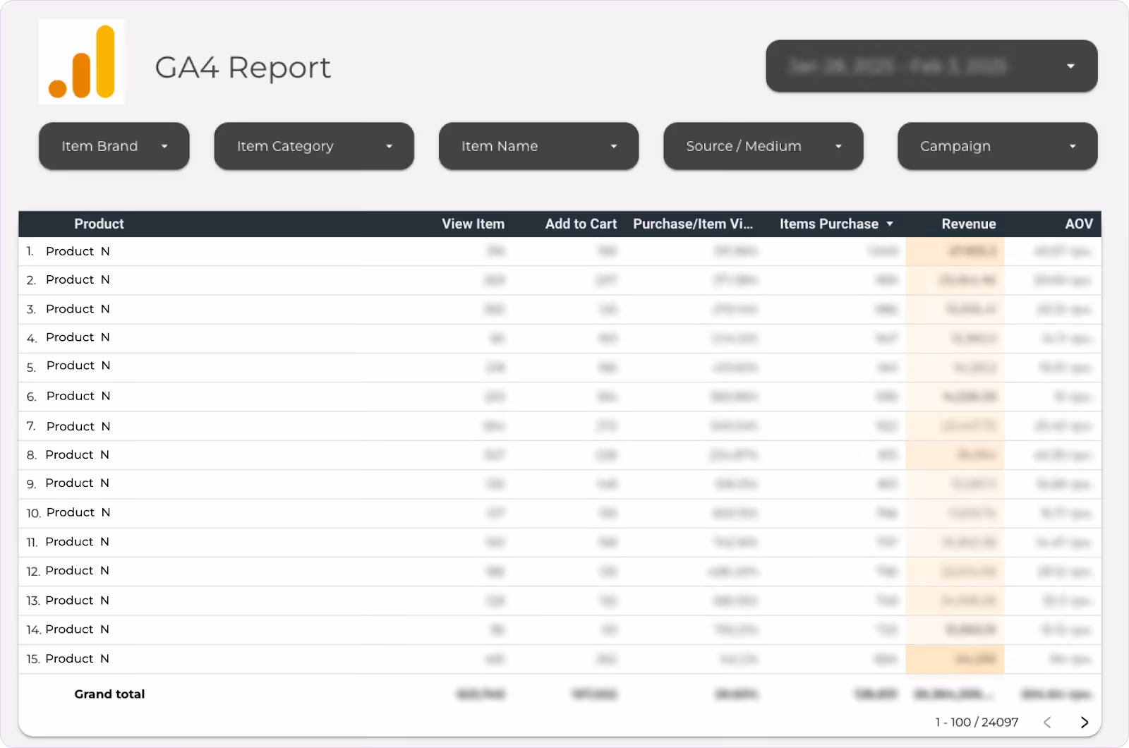 The report allows filtering data by categories, brands, and individual products. This helps identify the most popular items and view their performance across different marketing channels.