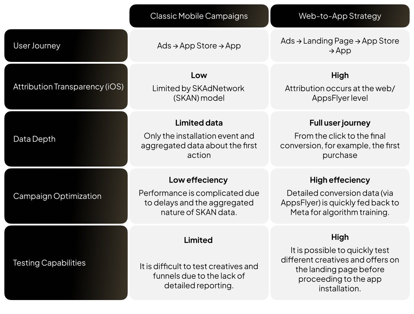 By running classic mobile campaigns in parallel with the Web-to-App model, we were able to evaluate their performance.
